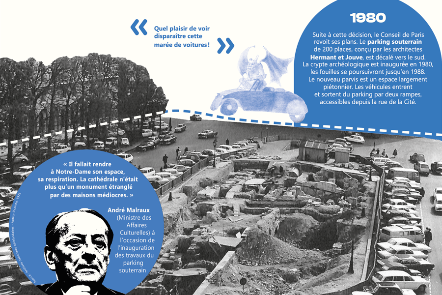 « Accueil en perspective » met en lumière le projet d’aménagement du parvis de Notre Dame. Il présente l’histoire du lieu, du XIXe siècle à nos jours. À la croisée du lien à la Seine retrouvé, de l’entrée de la cathédrale et de la crypte archéologique, le nouveau hall d’accueil offrira un point de restauration et assurera l'accessibilité pour tous à ce lieu emblématique de Paris. Laissez-vous guider par la gargouille dans la découverte de ces évolutions.