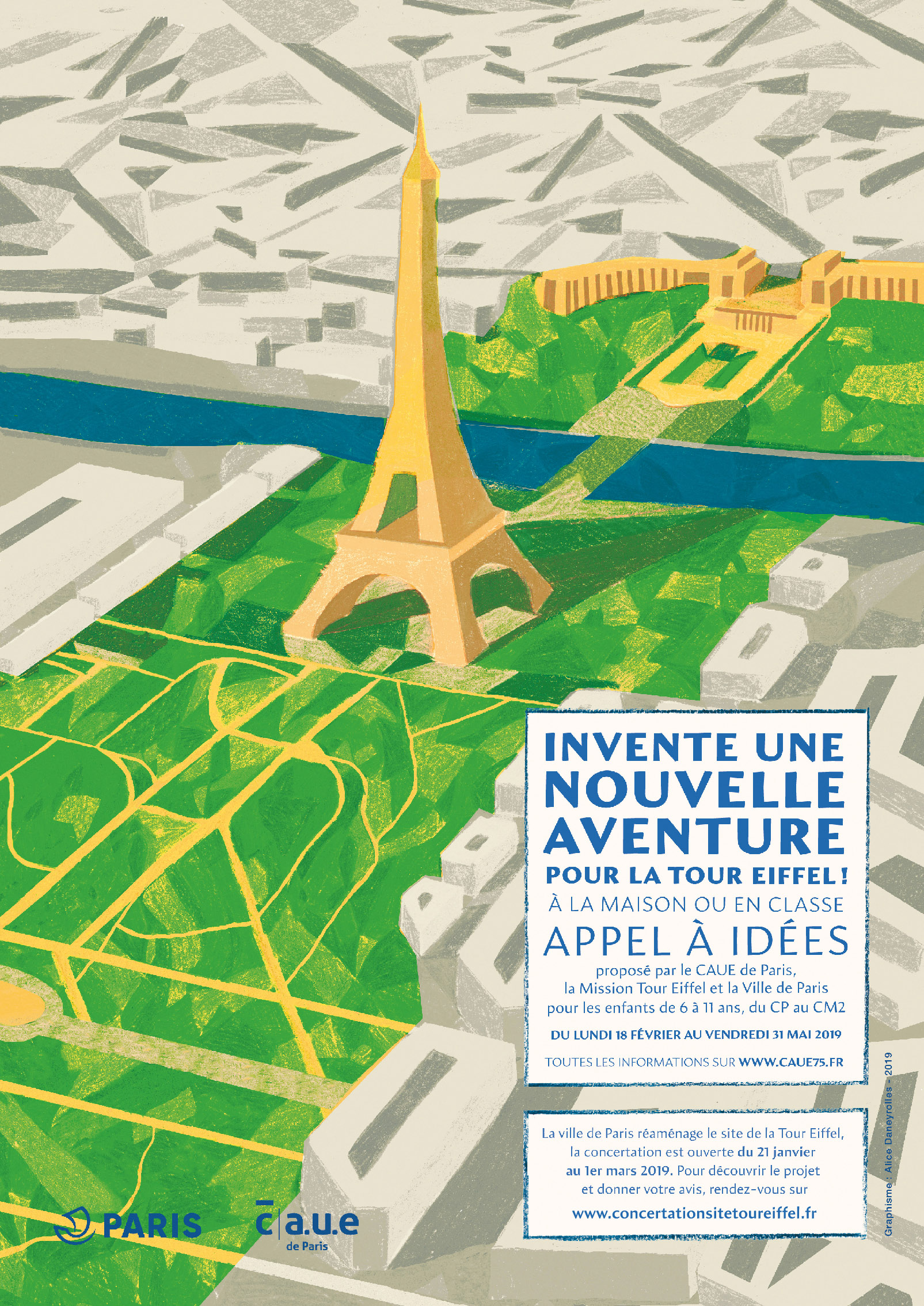INVENTE UNE NOUVELLE AVENTURE POUR LA TOUR EIFFEL est un appel à idées organisé par le Conseil d’Architecture d’Urbanisme et de l’Environnement de Paris, la Ville de Paris, et la Mission Tour Eiffel, service de la Direction des Constructions Publiques et de l’Architecture, qui ambitionne d’interroger les enfants sur le devenir du site Tour Eiffel, et la valorisation de ce monument remarquable.