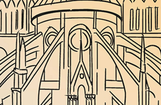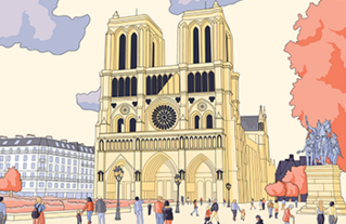 Les dessins illustrent l'histoire du parvis à la manière d’une frise chronologique, à travers des dates clés :