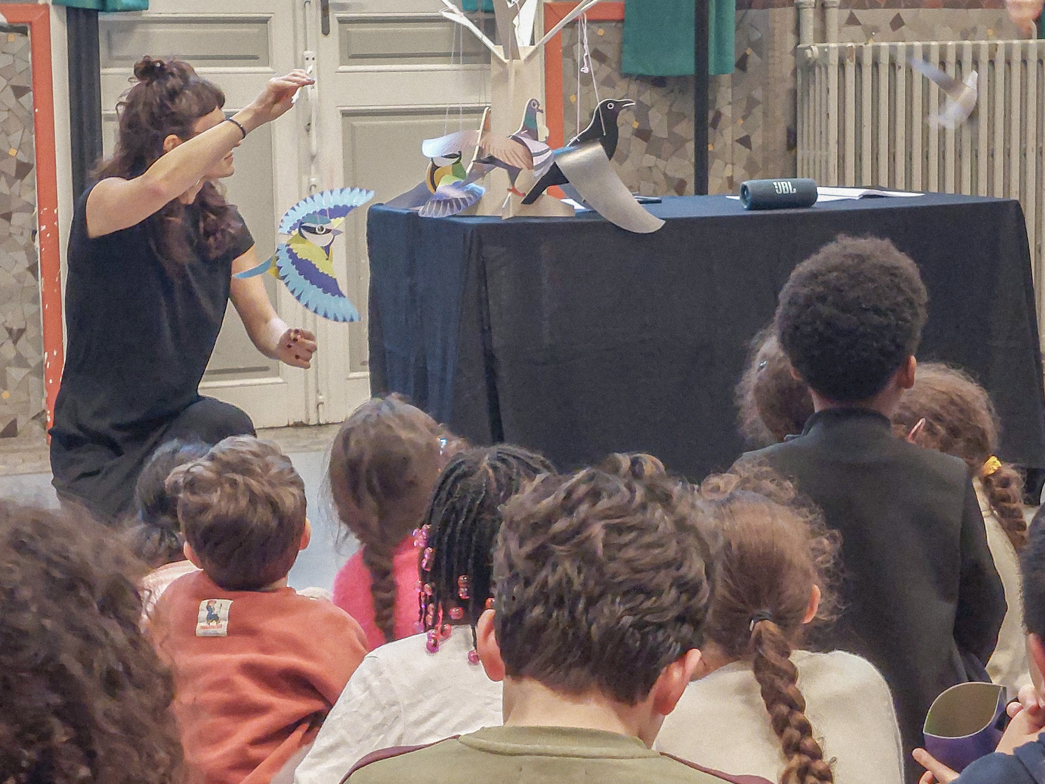 Le voyage de Plume transforme la salle en terrain d'aventure. Les enfants deviennent les compagnons de route d'une mésange à la recherche d'un lieu où s'installer à Paris. À chaque étape, ils participent activement : quiz avec pancartes colorées, reconnaissance de chants d'oiseaux, aide à la navigation.